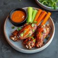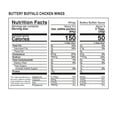 CHICKEN WING INGREDIENTS: CHICKEN WINGS, WATER, SALT, FOOD STARCH, SODIUM PHOSPHATES, DEXTROSE. COATED WITH: LONG GRAIN RICE FLOUR, SEASONING (SEA SALT, DEHYDRATED GARLIC, SPICES, SUNFLOWER OIL), RICE STARCH. PAR-FRIED IN VEGETABLE OIL. BUTTERY BUFFALO SAUCE INGREDIENTS: VINEGAR, RED JALAPEÑO PUREE (RED JALAPEÑO PEPPERS, WATER, CITRIC ACID), WATER, VEGETABLE OIL (CANOLA OIL AND/OR SOYBEAN OIL), SALT, SUGAR, GARLIC POWDER, SPICE, CULTURED DEXTROSE, NATURAL BUTTER FLAVOR (SUNFLOWER OIL, NATURAL FLAVORS, BUTTER), XANTHAN GUM, PAPRIKA EXTRACT, VITAMIN E, GREEN TEA EXTRACT. CONTAINS: MILK
