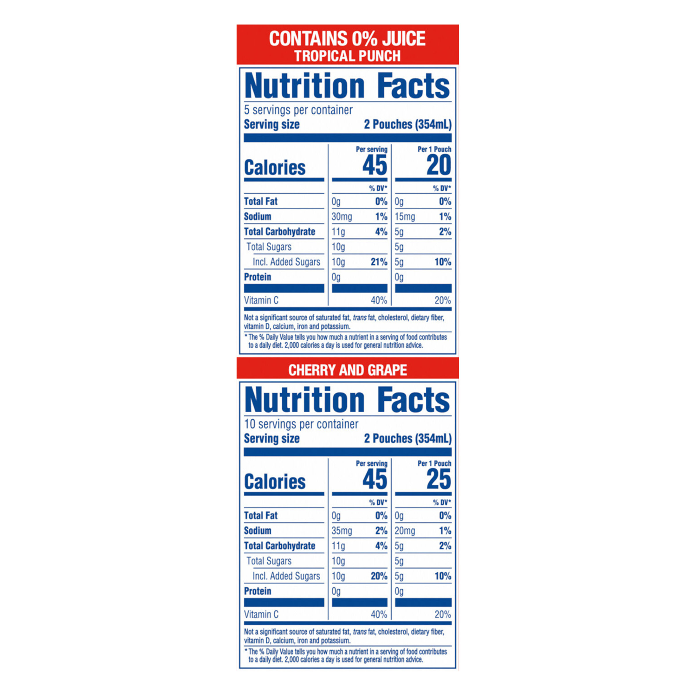 TROPICAL PUNCH FILTERED WATER, HIGH FRUCTOSE CORN SYRUP, CONTAINS LESS THAN 2% OF CITRIC ACID, ASCORBIC ACID (VITAMIN C), NATURAL AND ARTIFICIAL FLAVOR, SUCRALOSE (SWEETENER), BLUE 1, CALCIUM DISODIUM EDTA (TO PRESERVE FRESHNESS). GRAPE FILTERED WATER, HIGH FRUCTOSE CORN SYRUP, CONTAINS LESS THAN 2% OF CITRIC ACID, ASCORBIC ACID (VITAMIN C), NATURAL AND ARTIFICIAL FLAVOR, SUCRALOSE (SWEETENER), SODIUM CITRATE, RED 40, BLUE 1,CALCIUM DISODIUM EDTA (TO PRESERVE FRESHNESS). CHERRY FILTERED WATER, HIGH FRUCTOSE CORN SYRUP, CONTAINS LESS THAN 2% OF CITRIC ACID, ASCORBIC ACID (VITAMIN C), NATURAL AND ARTIFICIAL FLAVOR, SUCRALOSE (SWEETENER), RED 40, CALCIUM DISODIUM EDTA (TO PRESERVE FRESHNESS)