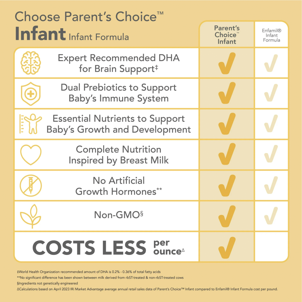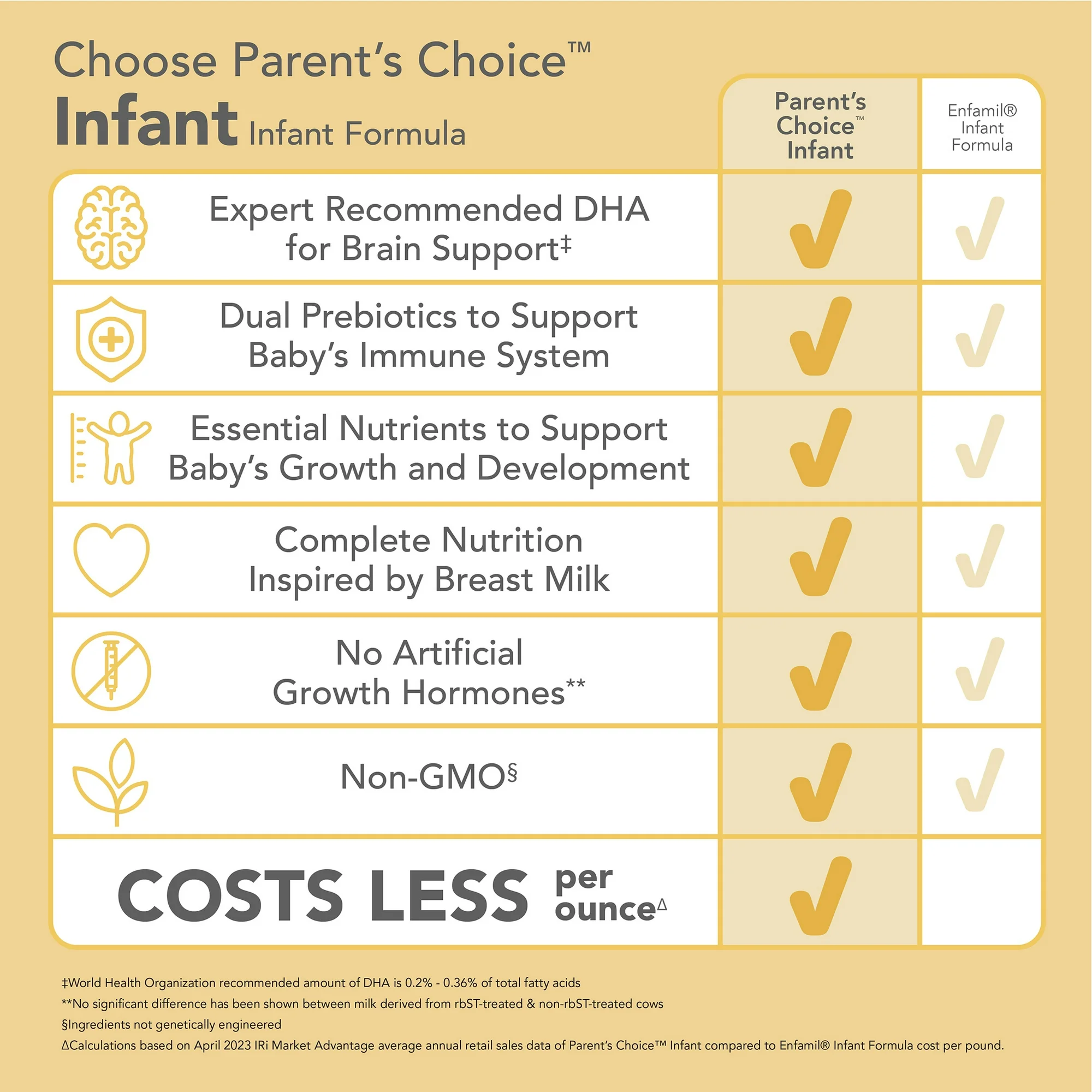 - SNAP Eligible: This can be purchased with Supplemental Nutrition Assistance Program (SNAP) benefits; like all U.S. infant formulas, Parent’s Choice Infant Formula meets the same FDA nutritional and quality standards as the national brands